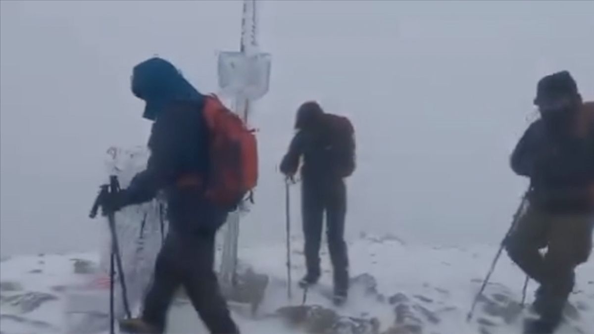 Kar yağışı ve tipi etkisini gösterirken bir grup dağcı, zorlu hava şartlarına rağmen zirveye tırmanış gerçekleştirdi. Dağcıların kar altındaki yürüyüşü kameralara yansıdı.