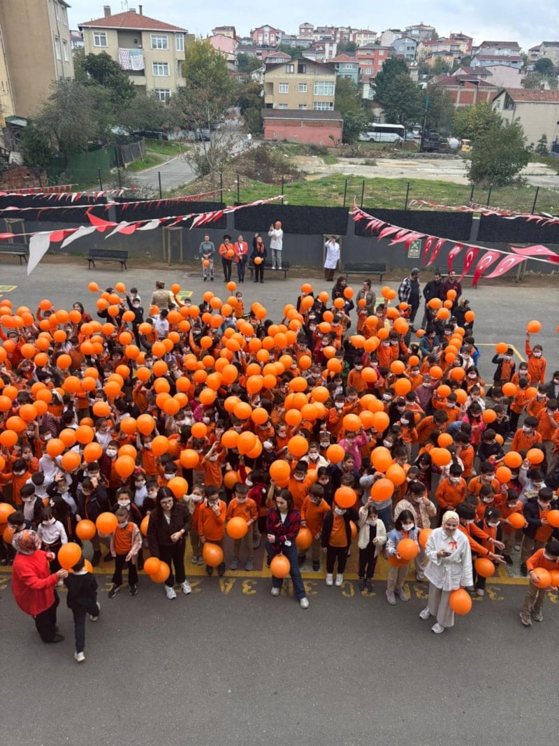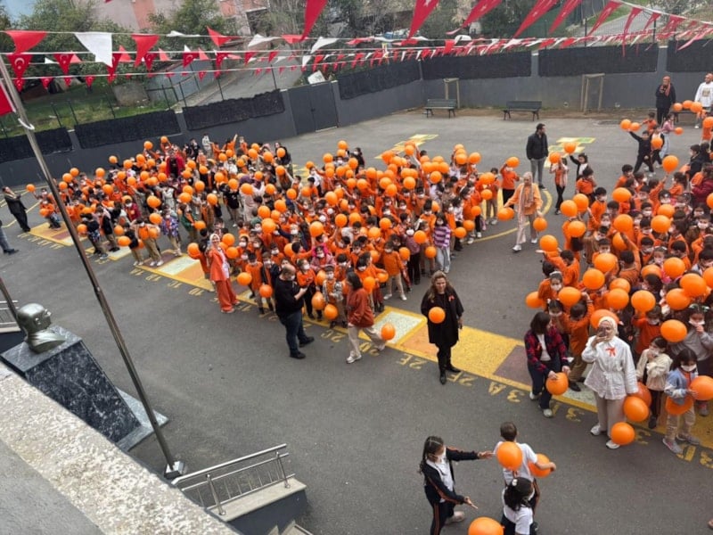 İstanbul Ümraniye'de bulunan Can Gür İlkokulu'nda çocuklar ve öğretmenler, LÖSEV'in Tüm Türkiye'yi turuncuya boyamaya yönelik çağrısına yanıt verdi ve Turuncu renkler giyinip ellerine turuncu balonlar alarak, maske takarak lösemili çocuklara destek oldu.