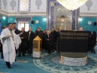 Umre öncesi Kâbe maketinin önünde tavaf eğitimi