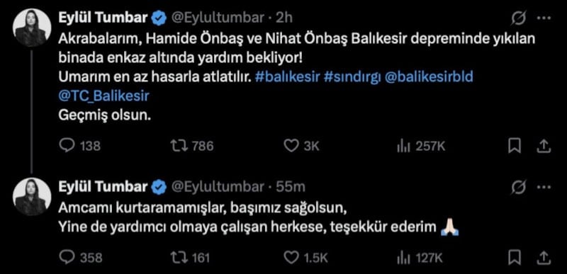 Oyuncu Eylül Tumbar, Balıkesir’deki 6.1 büyüklüğündeki depremde amcasının hayatını kaybettiğini duyurdu.
