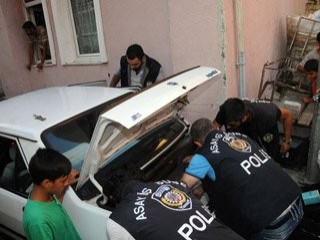 Polis ekipleri arama sırasında bir otomobilde bulunan kesici alete el koyarken, uyuşturucu ve suç aletlerinin saklanabileceği yerler dikkatle aradı.