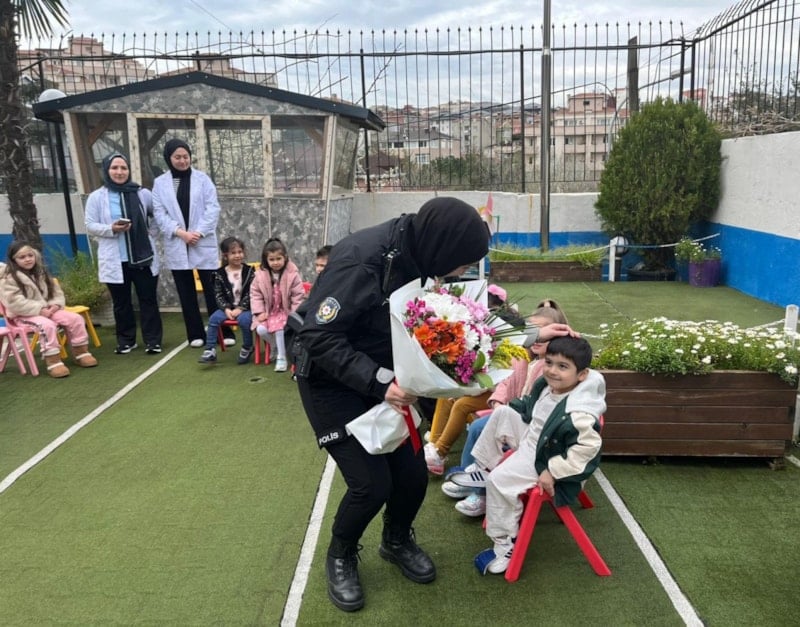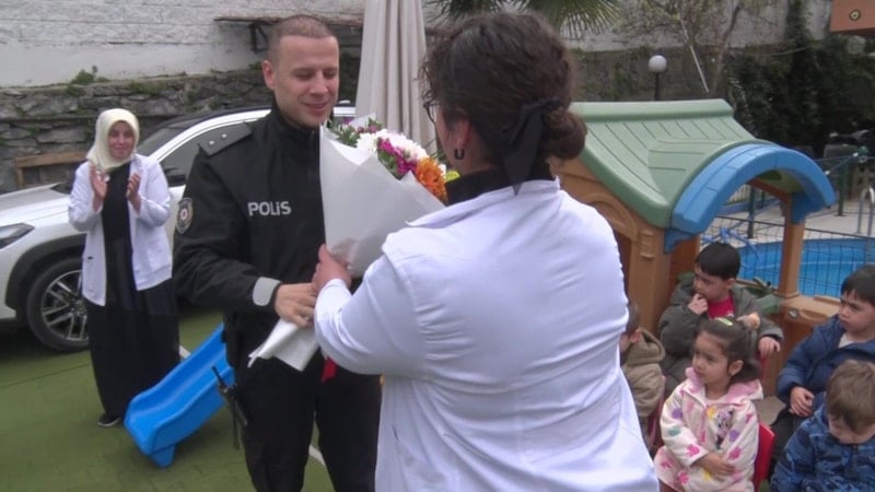 Olay yerine gelen ekipler, bekledikleri durumun aksine sürpriz bir kutlamayla karşılaştı. Anaokulu öğrencileri, polisleri alkışlar eşliğinde karşılarken, öğretmenler de çiçek takdim etti. Ardından hazırlanan pasta kesilerek Polis Haftası kutlandı.