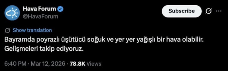 “Bayramda poyrazlı üşütücü soğuk ve yer yer yağışlı bir hava olabilir. Gelişmeleri takip ediyoruz.”