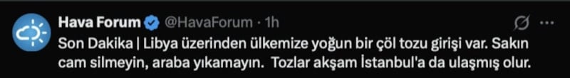 Meteoroloji kaynağı Hava Forum, X hesabı üzerinden yaptığı uyarıda, Libya üzerinden gelecek olan çöl tozu sebebiyle "cam silmeyin, araba yıkamayın" ifadelerini kullandı.