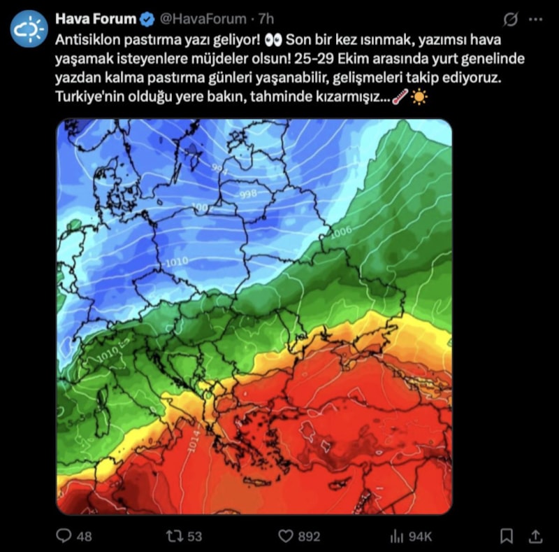 “Antisiklon pastırma yazı geliyor! Son bir kez ısınmak, yazımsı hava yaşamak isteyenlere müjdeler olsun! 25-29 Ekim arasında yurt genelinde yazdan kalma pastırma günleri yaşanabilir, gelişmeleri takip ediyoruz. Turkiye'nin olduğu yere bakın, tahminde kızarmışız…”