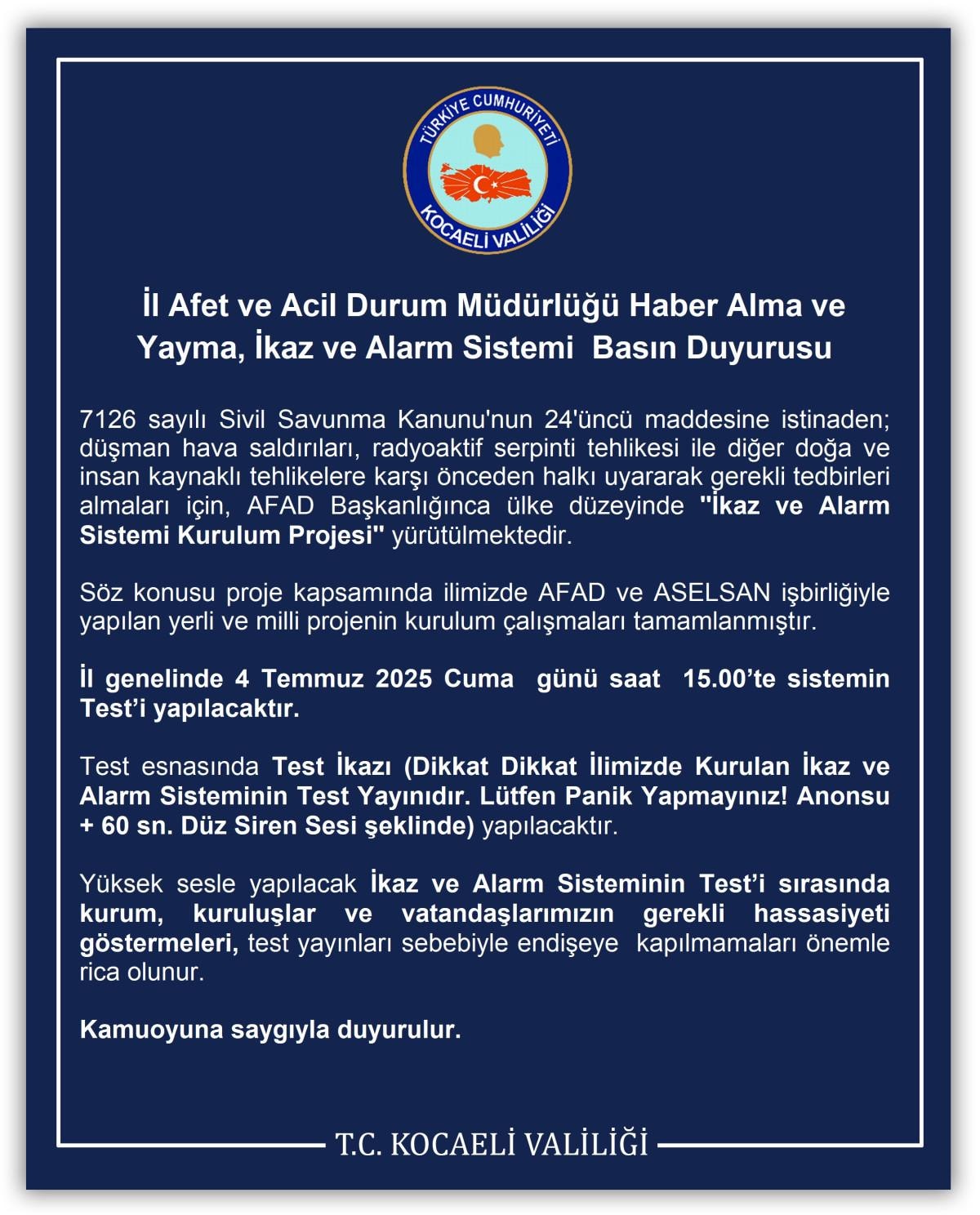 Bu kapsamda Kocaeli genelinde sirenler çalacak ve uyarı anonsları yapılacak. Kocaeli Valiliği tarafından yapılan açıklamada şu ifadelere yer verildi: