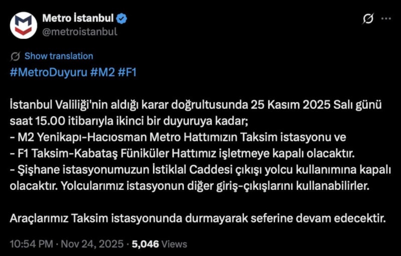 “İstanbul Valiliği'nin aldığı karar doğrultusunda 25 Kasım 2025 Salı günü saat 15.00 itibarıyla ikinci bir duyuruya kadar; M2 Yenikapı-Hacıosman Metro Hattımızın Taksim istasyonu ve F1 Taksim-Kabataş Füniküler Hattımız işletmeye kapalı olacaktır. Şişhane istasyonumuzun İstiklal Caddesi çıkışı yolcu kullanımına kapalı olacaktır. Yolcularımız istasyonun diğer giriş-çıkışlarını kullanabilirler. Araçlarımız Taksim istasyonunda durmayarak seferine devam edecektir”