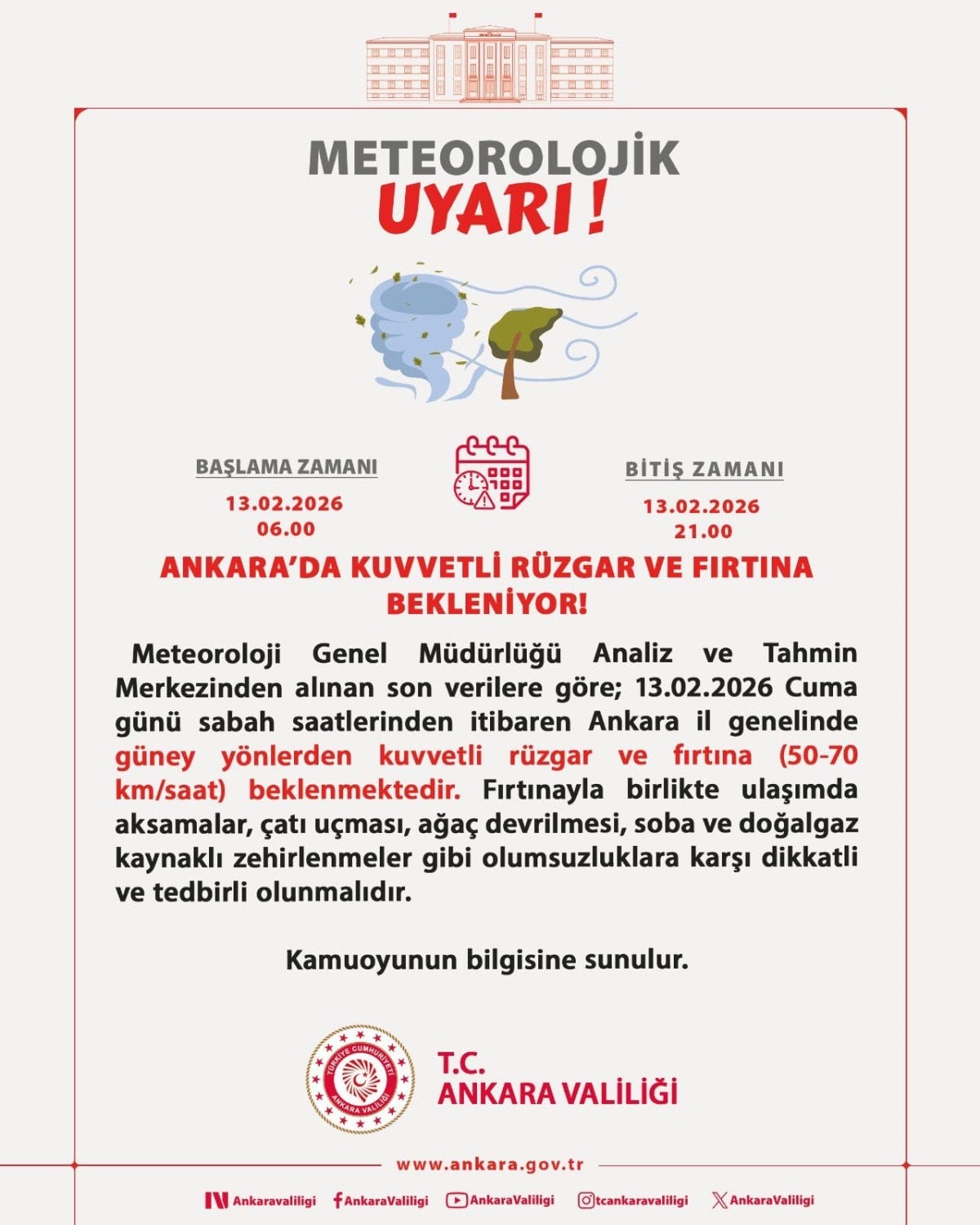 - Ankara Valiliği, 13 Şubat'ta beklenen fırtına nedeniyle uyardı.