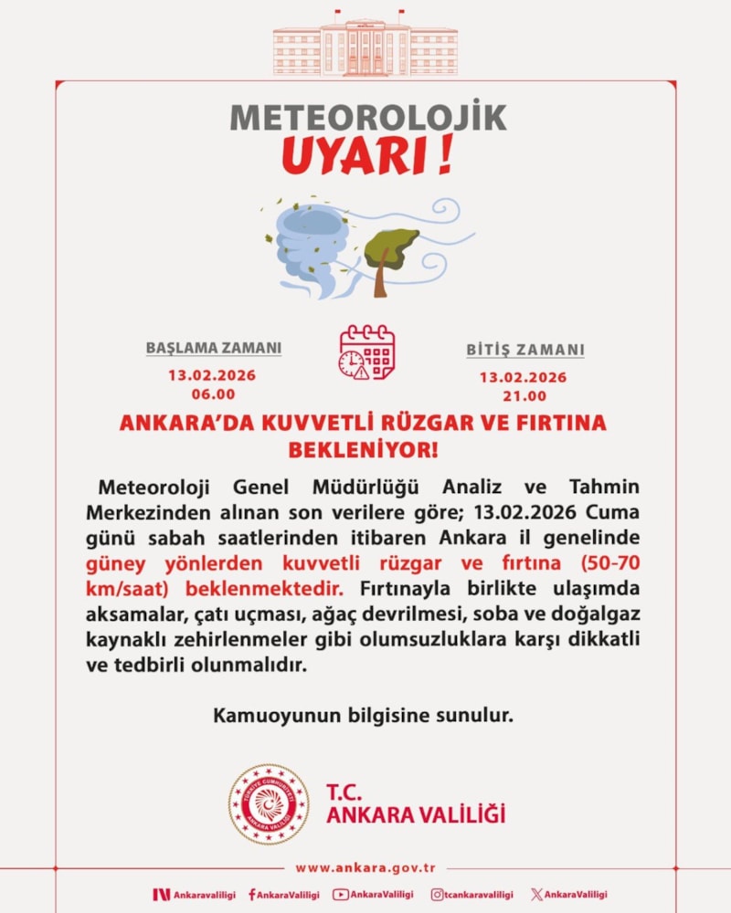 Meteoroloji Genel Müdürlüğü Analiz ve Tahmin Merkezinden alınan son verilere göre; 13 Şubat 2026 Cuma günü sabah saatlerinden itibaren Ankara il genelinde güney yönlerden kuvvetli rüzgar ve fırtına (50-70 kilometre/saat) beklenmektedir.