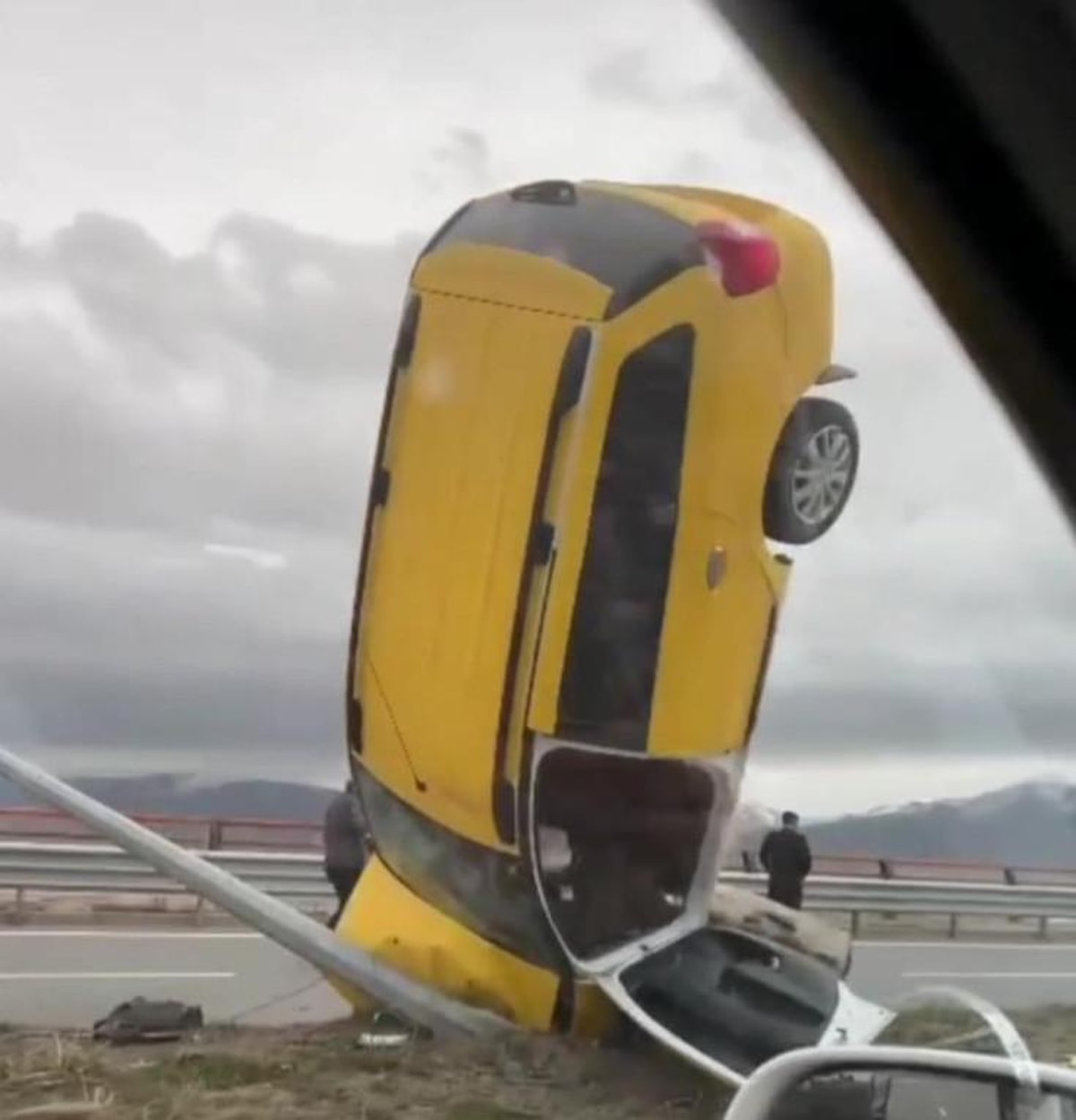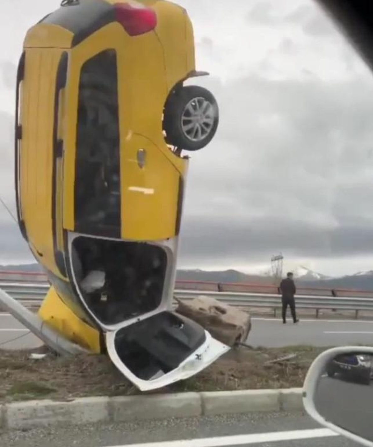 Otomobilin kaza sonrası dik şekilde durması görenleri hayrete düşürdü.