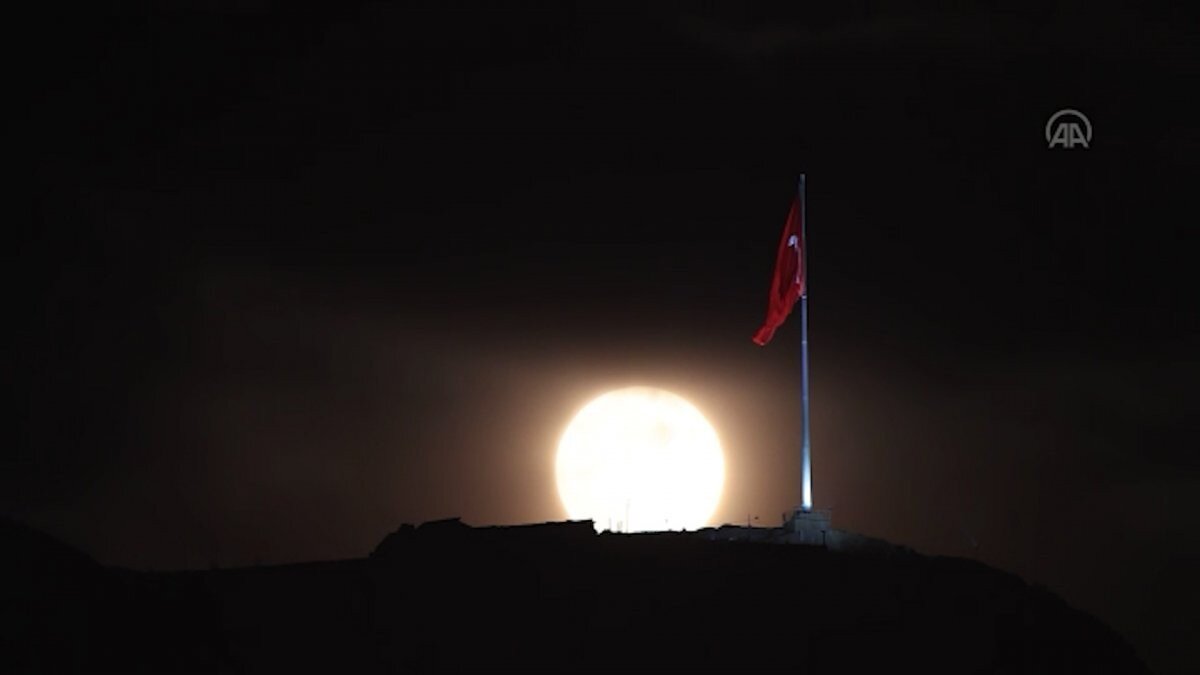 Van semalarında kendisini gösteren dolunay, Toprak Kale zirvesindeki bayrak ile güzel görüntüler meydana getirdi.