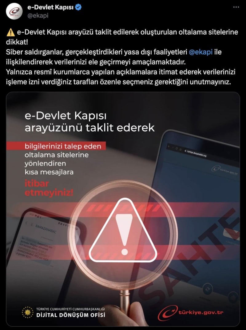 Cumhurbaşkanlığı Dijital Dönüşüm Ofisi, e-Devlet Kapısı'nın sosyal medya hesabından kullanıcıları arayüz taklitçilerine karşı uyarısını alıntılayarak bir paylaşımda bulundu.
