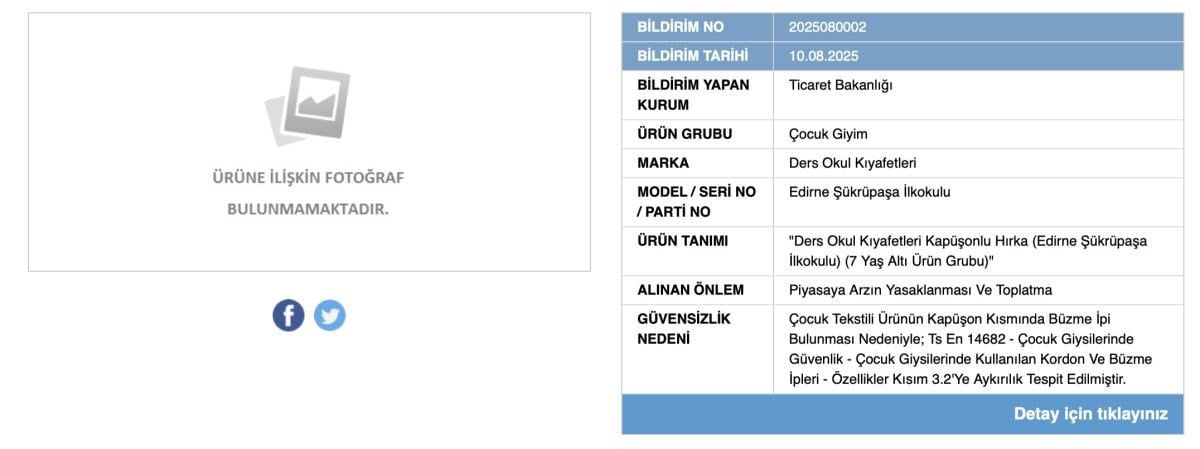Toplatılan ürün, özellikle 7 yaş altı çocuklar için tasarlanmış kapüşonlu hırka modeli olarak belirtiliyor.