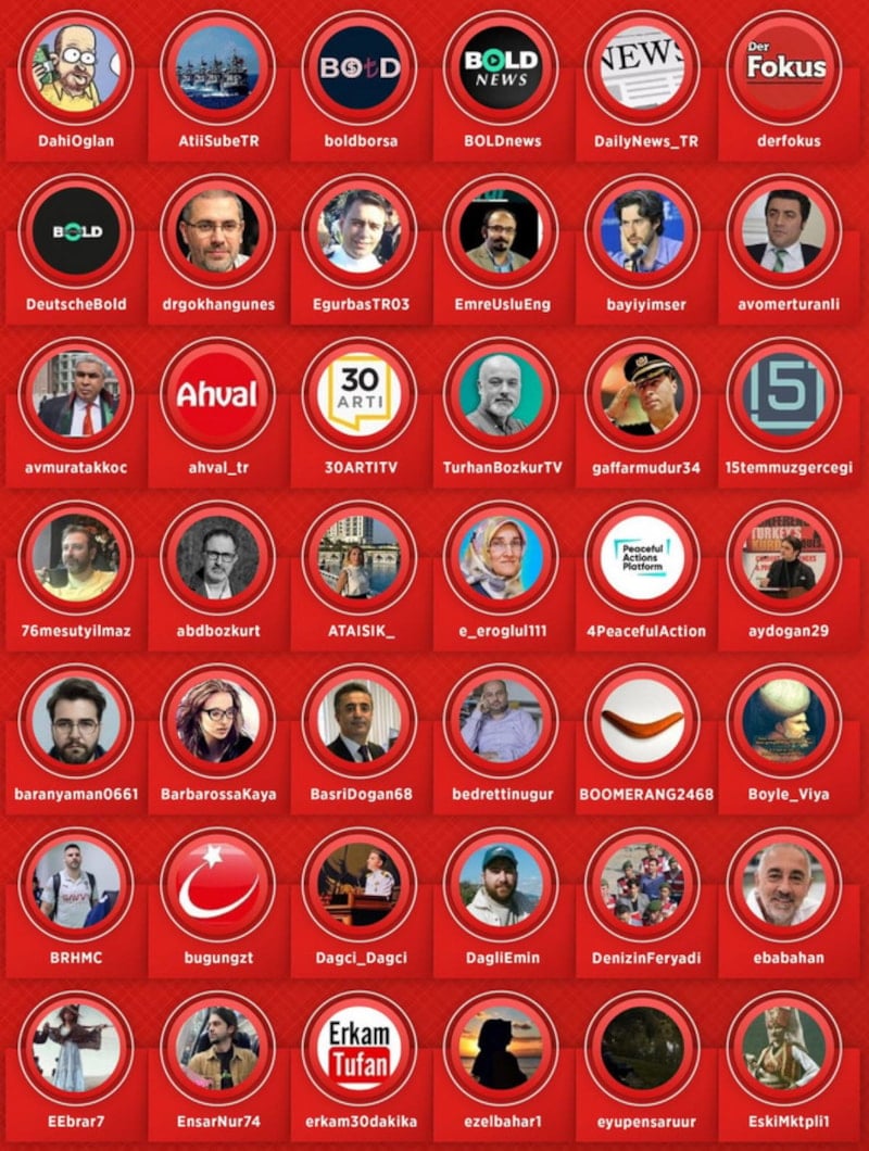 DahiOglan, AtiiSubeTR, boldborsa, BOLDnews, DailyNews_TR, derfokus, DeutscheBold, drgokhangunes, EgurbasTRO3, EmreUsluEng, bayiyimser, avomerturanli, ahval_tr, 30ARTITV, TurhanBozkurTV, gaffarmudur34, 15temmuzgercegi, abdbozkurt, ATAISIK_, e_eroglul111, 4PeacefulAction, BarbarossaKaya, BasriDogan68, bedrettinugur, BOOMERANG2468, Boyle_Viya, BRHMC, bugungzt, DagliEmin, DenizinFeryadi, EEbrar7, EnsarNur74, erkam3Odakika, ezelbahar1, eyupensaruur, EskiMktplil