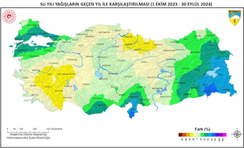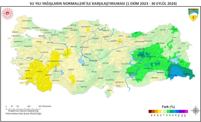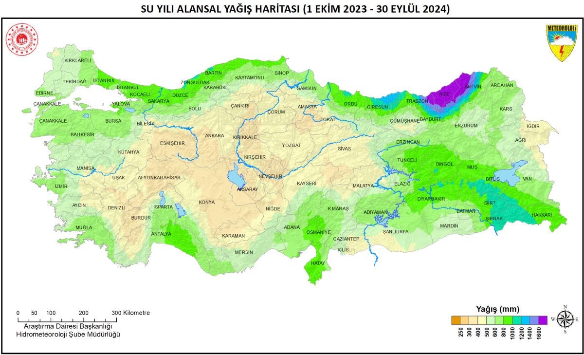 Meteoroloji Genel Müdürlüğü'nün 2023-2024 Su Yılı 12 Aylık Alansal Kümülatif Yağış Raporu'na göre, 1 Ekim 2023-30 Eylül 2024 dönemini kapsayan 2024 su yılı yağışları, normali ve geçen yıl yağışlarının üzerinde tamamlandı.