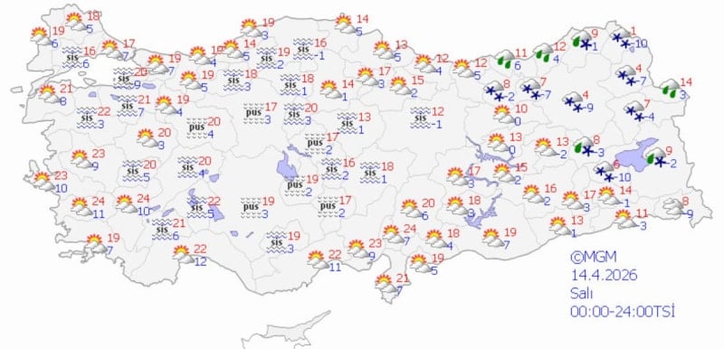 İç Anadolu, Karadeniz ve Doğu Anadolu'nun bazı kesimlerinde pus ve yerel sağanak yağışlar görülebilir.