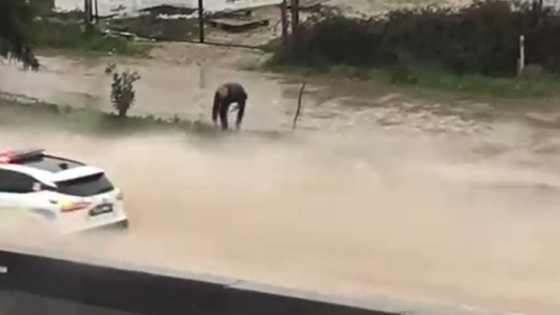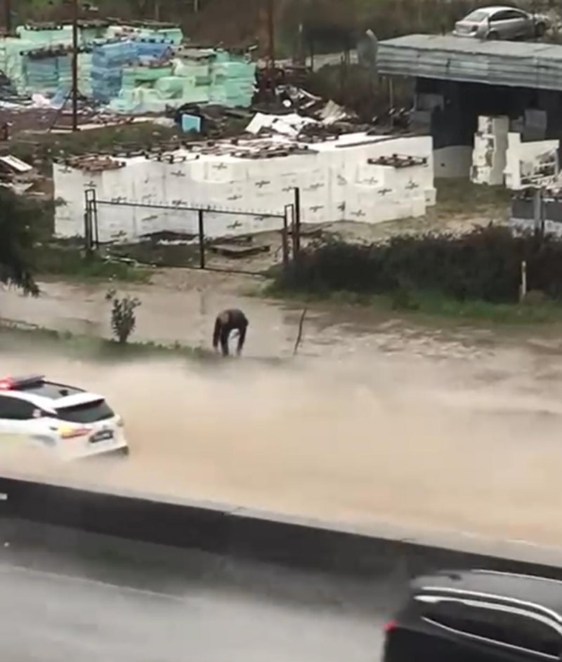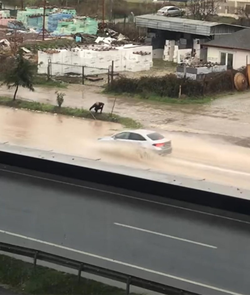 Yağış devam ederken bir vatandaş, kara yolu kenarında tıkanan gideri açmak için araçların üzerine sıçrayan suya rağmen cansiparane şekilde çalışarak yaşanan su baskınının önüne geçti.