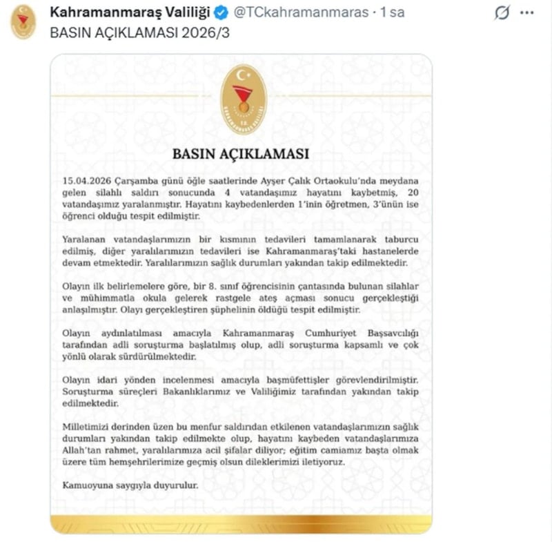 15 Nisan’da Kahramanmaraş’ta gerçekleşen silahlı saldırıda 1'i öğretmen 4 kişinin hayatını kaybettiği, 20 kişinin yaralandığı açıklandı.