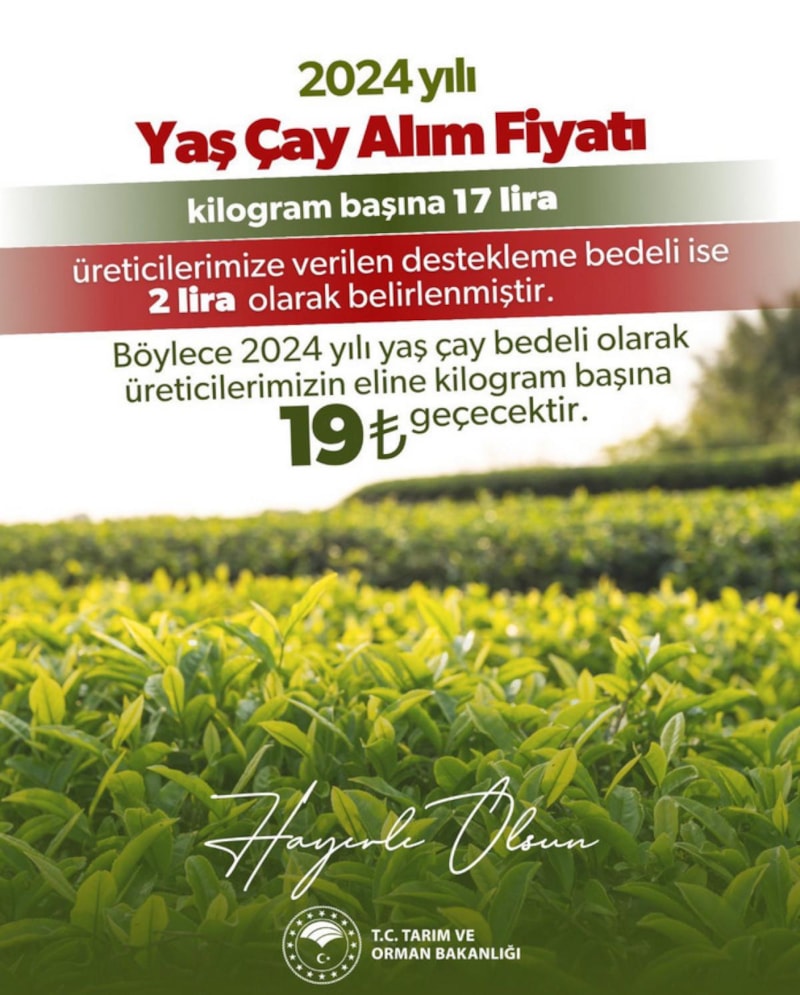 "2024 yılı yaş çay alım fiyatı kilogram başına 17 lira, üreticilerimize verilen destekleme bedeli ise 2 lira olarak belirlenmiştir.