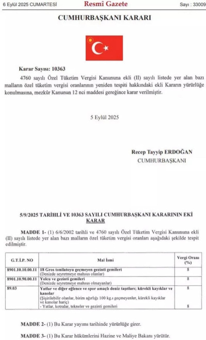 6 Eylül 2025 tarihli Resmi Gazete’de yayımlanan Cumhurbaşkanı Kararı ile yat ve gezi teknelerinde Özel Tüketim Vergisi (ÖTV) oranları %8’e yükseltildi.