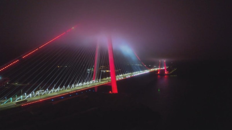 İstanbul Boğazı’nda etkisini artıran sis, Yavuz Sultan Selim Köprüsü’nün bir bölümünü adeta görünmez kılarken, köprünün ışıklandırmalarıyla birleşen sis perdesi, gökyüzünde görsel bir şölen oluşturdu.