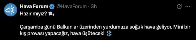 Sıcaklıkların düşeceğini belirten Hava Forum, paylaşımında şu ifadeleri kullandı: