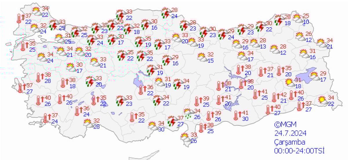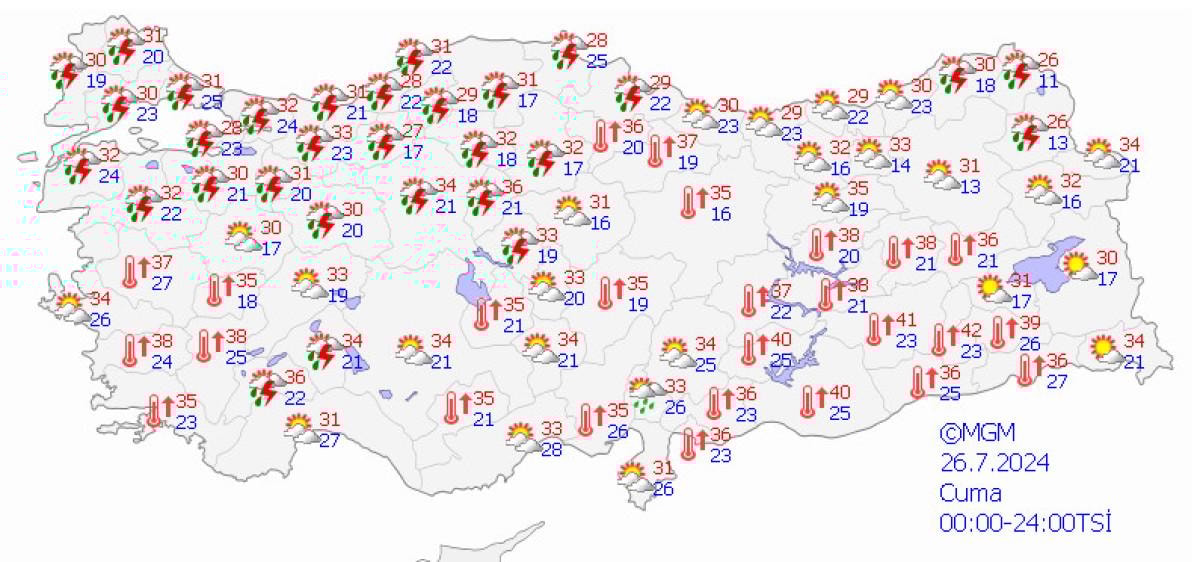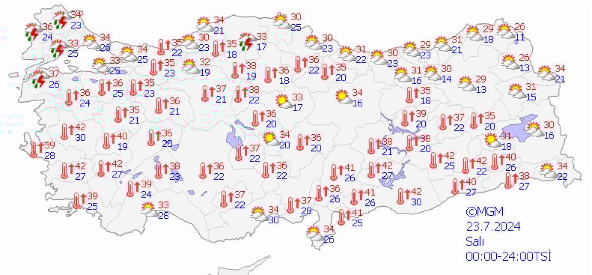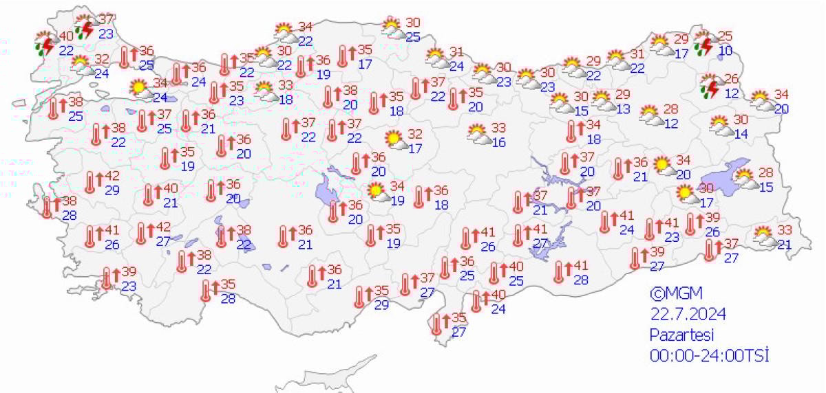 Ege Bölgesi’nde ise aşırı sıcaklıklar devam ederken, rüzgarlar artık daha nemli esmeye başladı. Bu durum hissedilen sıcaklıkların termometre değerlerinin çok üzerine çıkmasına neden olacak. Manisa ve Denizli’de gölgede sıcaklık 42, Muğla’da 39, Kütahya’da 36 ve Bodrum’da ise 40 derece olarak ölçülecek.