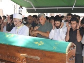 Kocaeli'nin Başiskele İlçesi Serdar Camii'nde cenaze namazı öncesinde baba Ersin Çelik taziyeleri kabul etti.