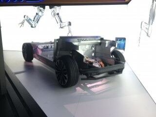 Etkinlik alanında bulunan yerli otomobilin şasesi dikkat çekiyor.