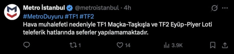 “Hava muhalefeti nedeniyle TF1 Maçka-Taşkışla ve TF2 Eyüp-Piyer Loti teleferik hatlarında seferler yapılamamaktadır.”