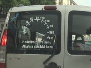 Kameralara yansıyan söz konusu aracın arkasındaki 180 kilometreyi gösteren hız ibresi resmi ve "Hedefimiz ibre sonu, Allah'ım sen bizi koru" yazısı, araç arkası yazılarına ilginç örneklerden biri.