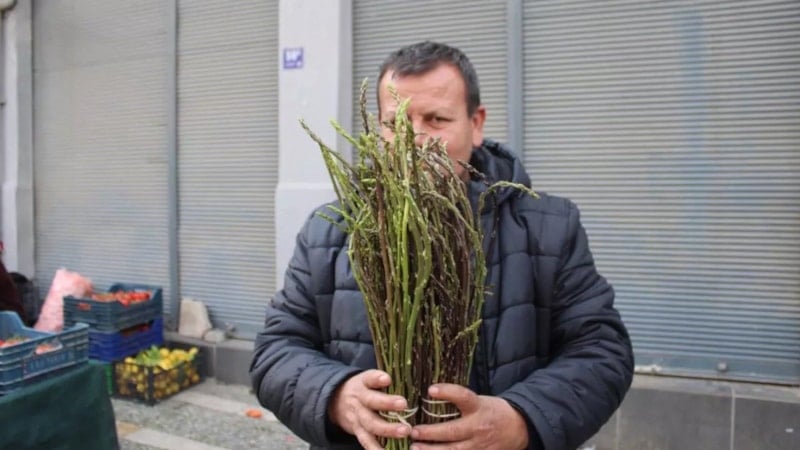 “Aydın’ımızın meşhur otu olan kedirgen sezonumuz başladı. Bu hafta ilk kedirgenlerimizi getirdik. Kuşkonmaz olarak da bilinir ama yöremizin kedirgeni farklıdır. Dağlarda kendiliğinden yetişir. Yağmurlardan sonra baharda çıkar bu. Faydalı bir bitki. Bilhassa idrar yolları iltihabına çok faydalıdır. Dağlardan toplaması da bir o kadar zahmetlidir. Toplandığı yerler açısından zahmetli ama zevkli bir şey. Herkes yerini bulamaz ama toplayan bilir onu. Toplaması da çok zevkli olur. Bölgemizin önemli lezzetlerinden. İlk kedirgenleri satmaya başladık. Bağı 150 TL’den satıyoruz. Yağışlar devam ederse bunlar da olmaya devam edecek”