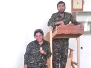 Fotoğraflarda camideki Kur'an-ı Kerimleri bir araya toplayan teröristlerin, vaaz verip namaz kılar gibi yaparak İslami değerlerle dalga geçtikleri görülüyor.