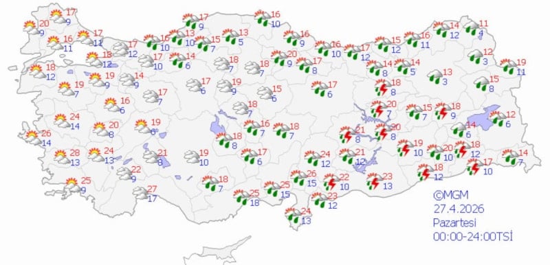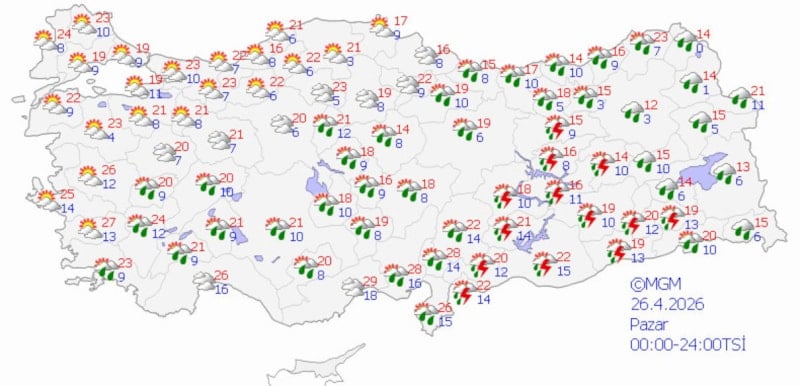 MGM'nin son verilerine göre Türkiye'nin batı ve güney kesimleri daha stabil ve güneşli bir hava alırken, doğu ve iç bölgelerde gök gürültülü sağanak yağışlar etkili olacak. Sıcaklıkların ise ülke genelinde mevsim normallerinin biraz altında kalması bekleniyor.