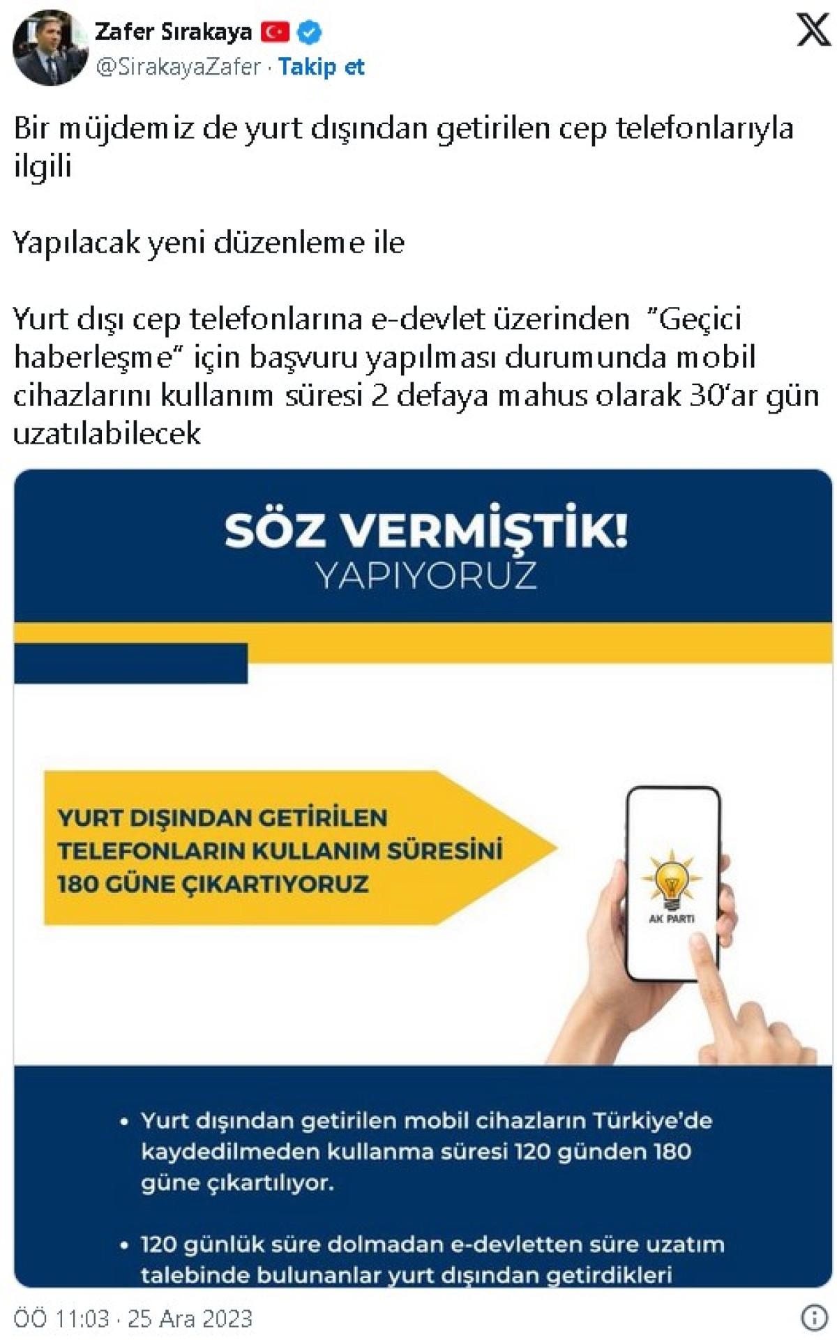 AK Parti Dış İlişkilerden Sorumlu Genel Başkan Yardımcısı Zafer Sırakaya, yapılacak yeni düzenleme ile yurt dışı cep telefonlarına e-Devlet üzerinden 'Geçici haberleşme' için başvuru yapılması durumunda mobil cihazlarını kullanım süresi 2 defaya mahsus olarak 30'ar gün uzatılabileceğini açıkladı.