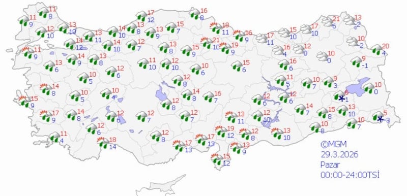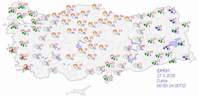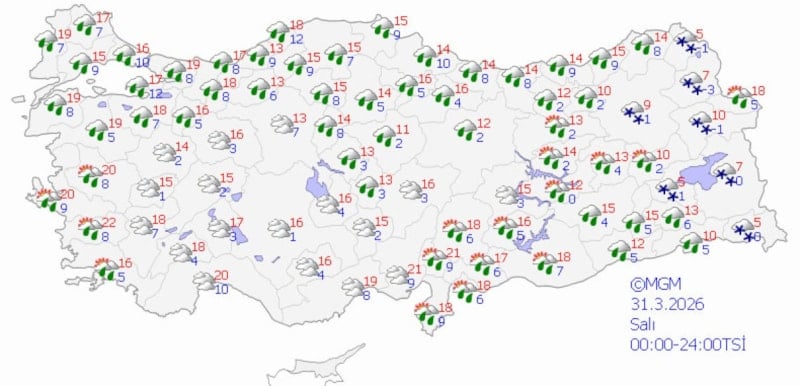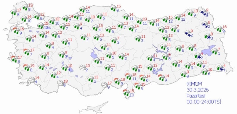 Türkiye genelinde Meteoroloji Genel Müdürlüğü'nün (MGM) son verilerine göre, ülke büyük ölçüde parçalı ve çok bulutlu bir hava ile birlikte yer yer yağışlı geçecek.