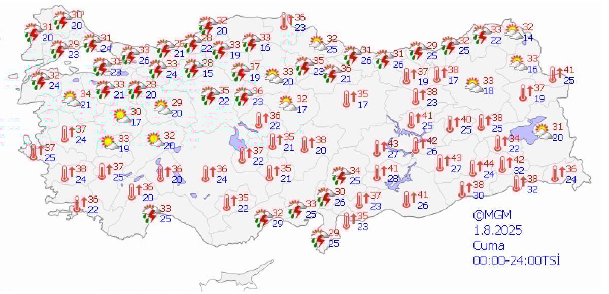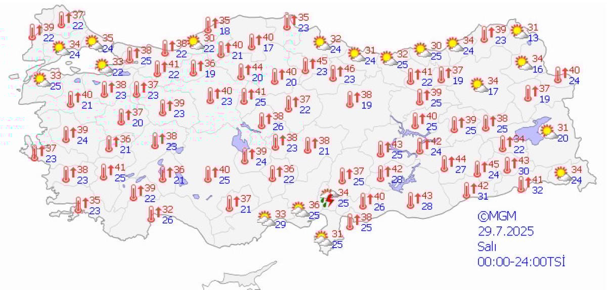 Sıcaklıklar, Şırnak, Diyarbakır, Şanlıurfa, Mardin, Siirt, Eskişehir, Batman, Aydın, Gaziantep, Adıyaman, Kahramanmaraş, Karabük, Bilecik, Manisa, Kilis, Malatya, Elazığ, Karaman, Hatay, Kütahya, İzmir, Uşak, Balıkesir, Mersin, Bingöl, Kastamonu, Zonguldak, Denizli, Bartın, Muğla, Sakarya, Antalya, Edirne, Burdur, Afyonkarahisar, Tunceli, Erzincan, Bolu, Konya, Bursa, Isparta, Ankara, Adana, Çanakkale, Kayseri, Kocaeli ve Erzurum'da gölgede ve yerden 2 metre yükseklikteki siper içinde yapılan ölçümlerde 40 derecenin üzerinde ölçüldü.