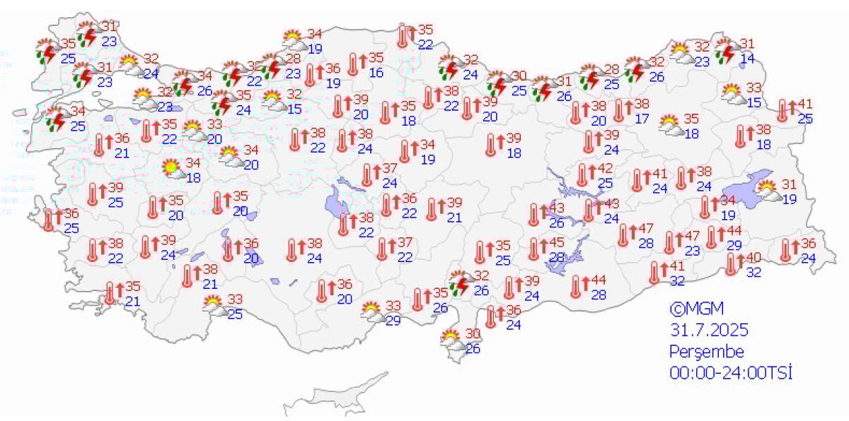 Yurt genelinde bugün en yüksek sıcaklık 49,1 dereceyle Şırnak'ın Cizre ilçesinde ölçüldü.