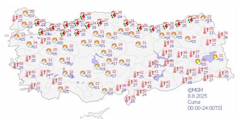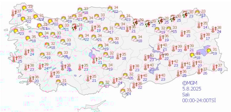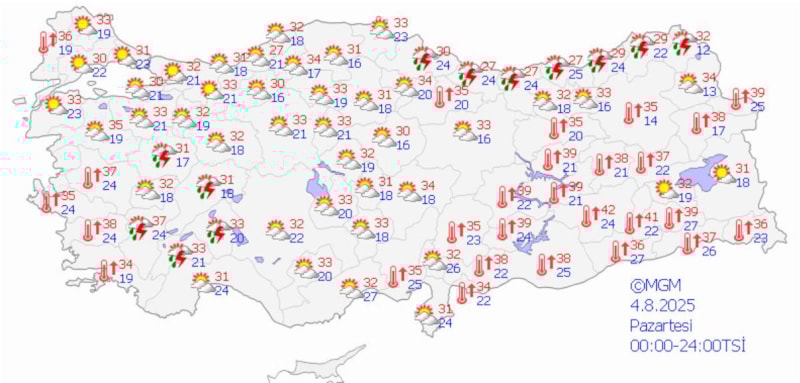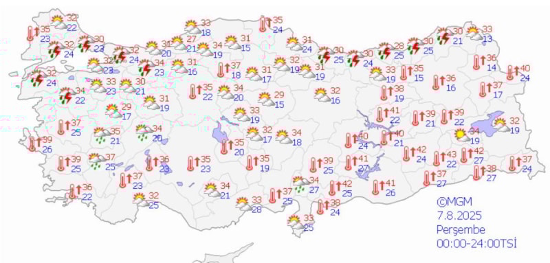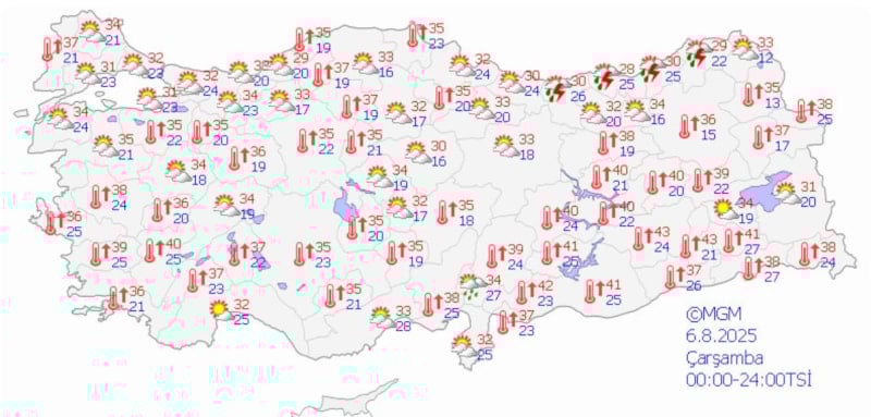 Yurt genelinde günün en yüksek sıcaklığı, 44,7 dereceyle Şırnak Cizre'de ölçüldü. Bunu Siirt'in Kurtalan ilçesi 42,3, Diyarbakır'ın Bağlar ilçesi ise 42,2 dereceyle takip etti.