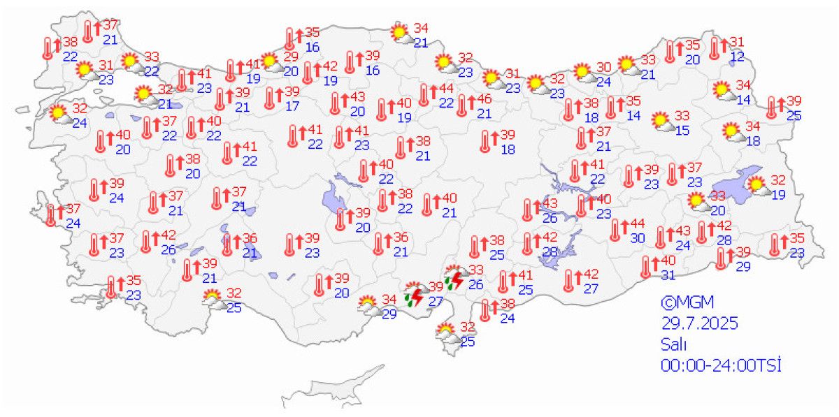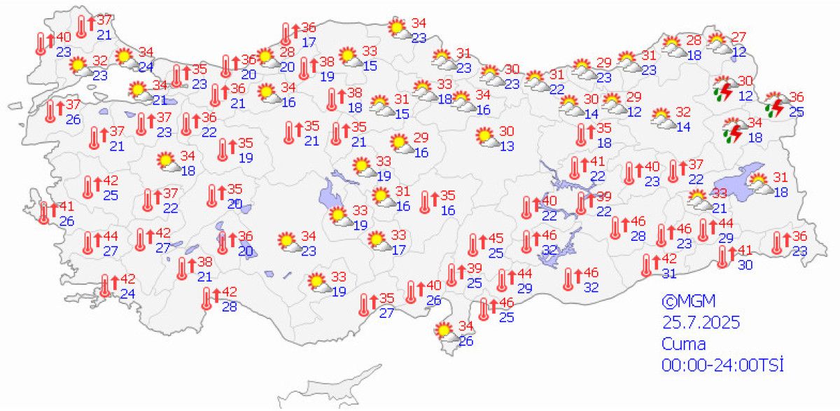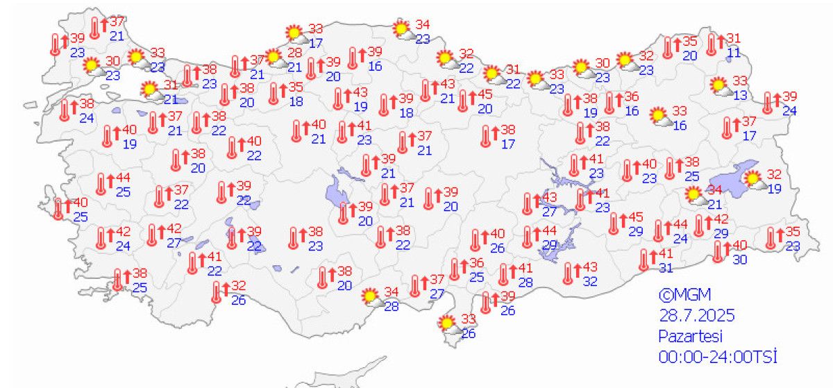 Bazı il merkezlerimizde; 19 Temmuz ilâ 25 Temmuz 2025 tarihleri arasında beklenen en yüksek hava sıcaklıklarının aşağıda belirtilen değerlere (°C) kadar yükseleceği tahmin edilmektedir.