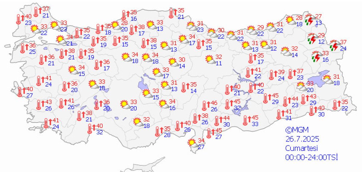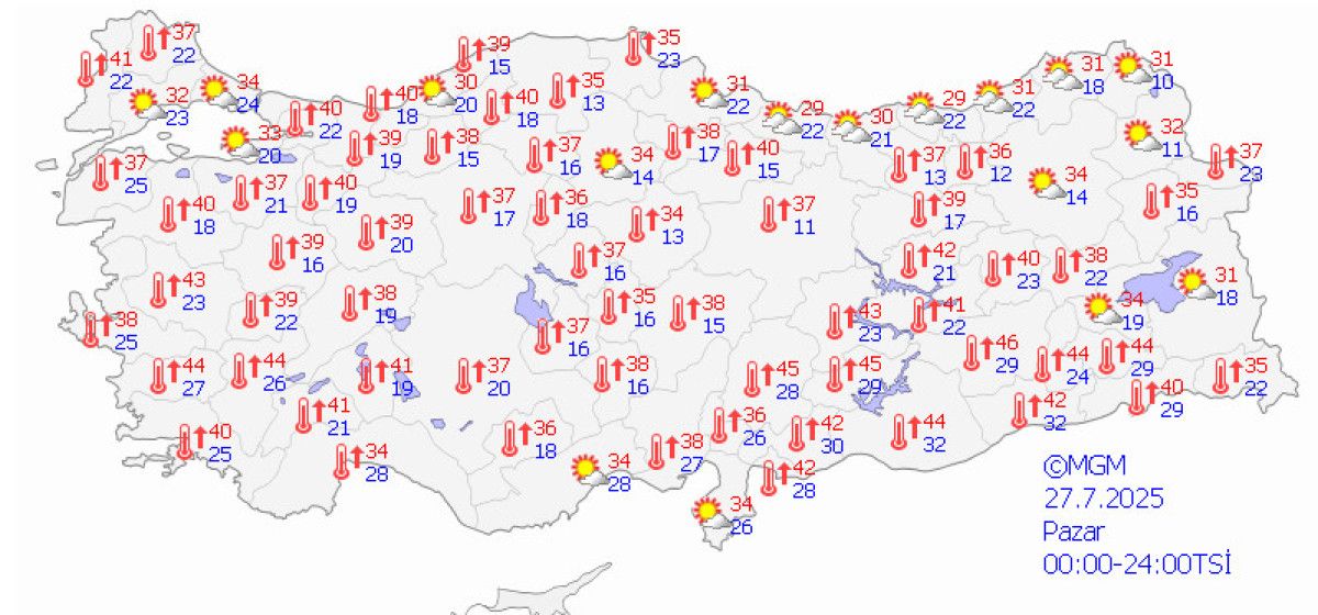"Halen Ülkemizde mevsim normalleri üzerinde seyreden hava sıcaklıklarının, 19 Temmuz 2025 Cumartesi gününden itibaren batı kesimlerden başlayarak artacağı ve Ülkemiz genelinde mevsim normallerinin 6 ilâ 12 derece üzerine çıkacağı tahmin edilmektedir.