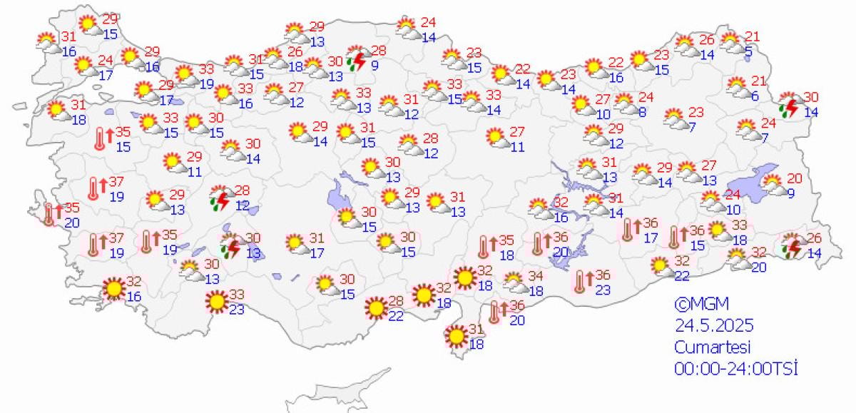 Haftanın ilk günü, 24 Mayıs Cumartesi, batı bölgelerde parçalı bulutlu bir hava hakim; sıcaklıklar 15-36 derece arasında değişiyor.
