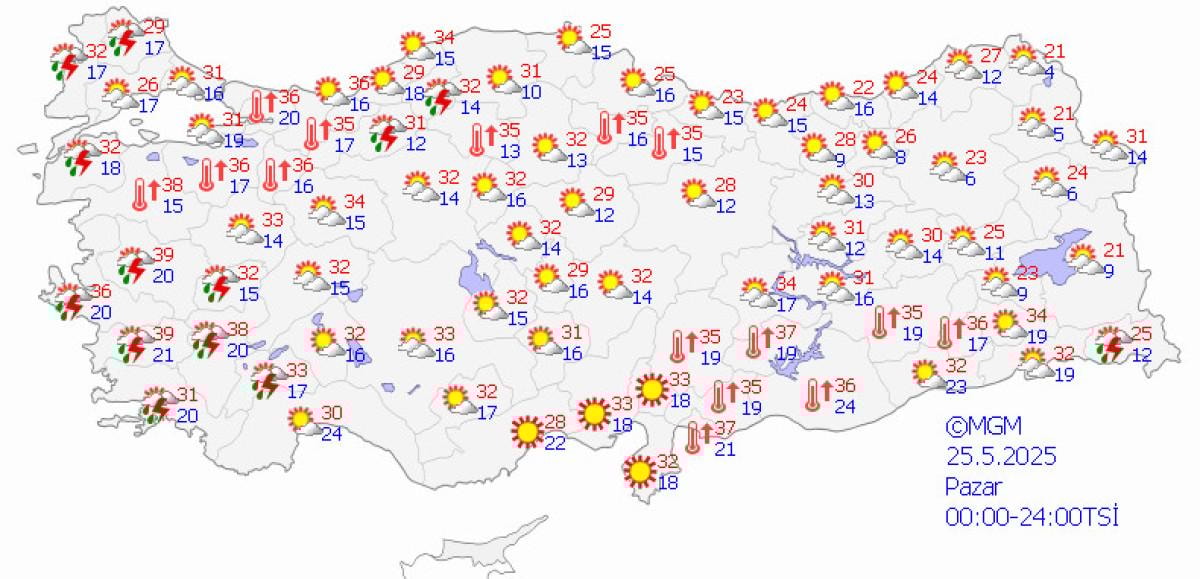 25 Mayıs Pazar günü, doğudaki yağışlar hafiflerken, batıda güneşli hava etkili olacak; sıcaklıklar 12-37 derece arasında seyredecek.