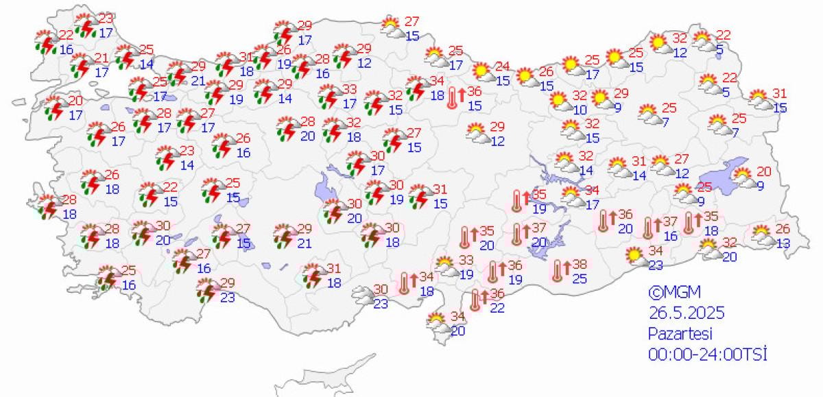 26 Mayıs Pazartesi günü, doğuda sıcaklıklar 39 dereceye kadar çıkarken, batıda 11-36 derece aralığında bir hava bekleniyor.