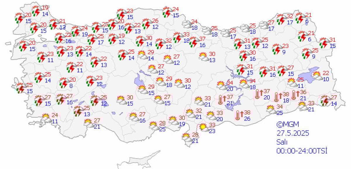 27 Mayıs Salı günü, doğuda sıcaklıklar rekor seviyelere ulaşarak 44 dereceyi görebilir.