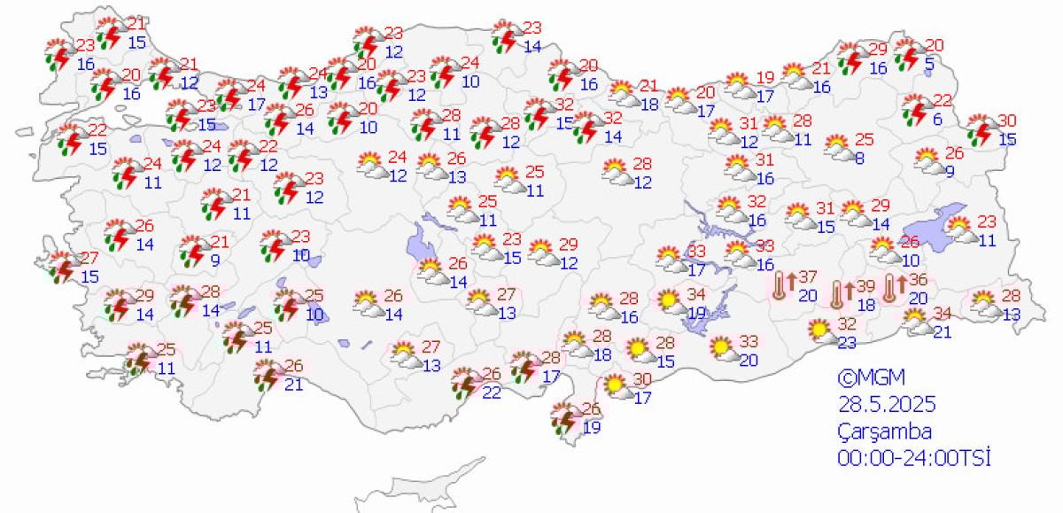 28 Mayıs Çarşamba, doğuda yüksek sıcaklıklar yerini yavaş yavaş serin havaya bırakacak.