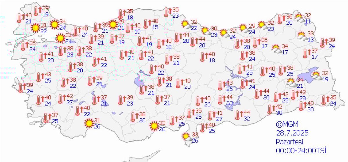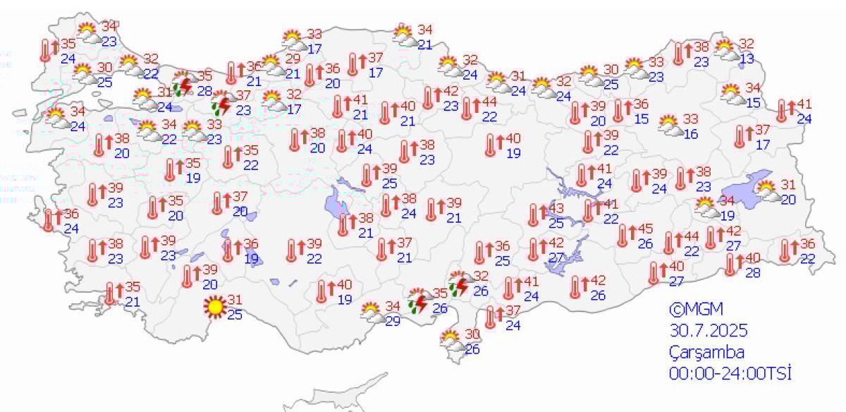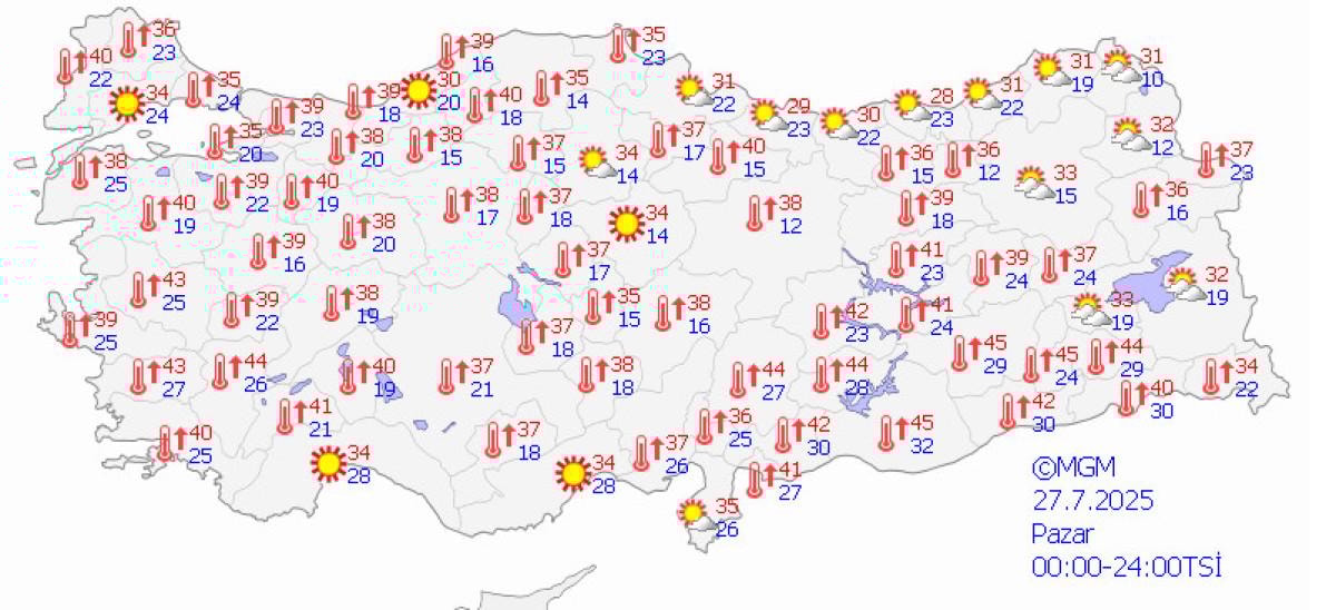"Yapılan son meteorolojik değerlendirmelere göre; Ülkemiz genelinde halen mevsim normalleri üzerinde seyretmekte olan hava sıcaklıklarının, Pazar (27.07.2025) gününden itibaren özellikle iç kesimlerde etkili olacağı tahmin edilmektedir.