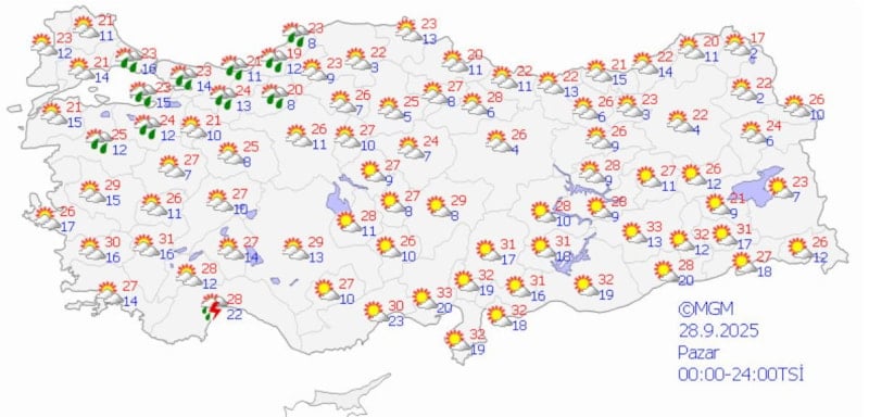Doğu Karadeniz kıyıları ve Kırklareli'nin doğusunda yerel sağanak bekleniyor. Burdur'un güney ve batısı ile Antalya çevresinde sağanak ve gök gürültülü sağanak yağış etkili olacak.