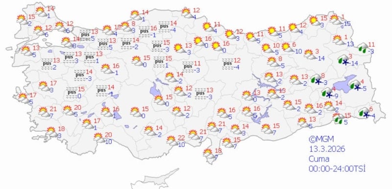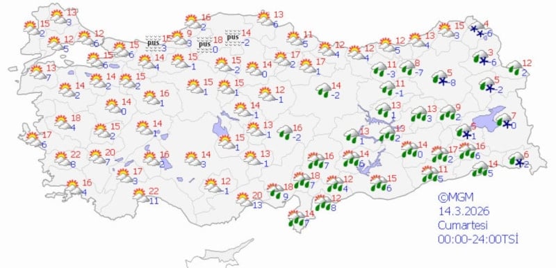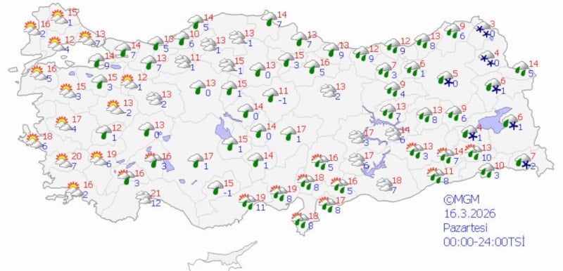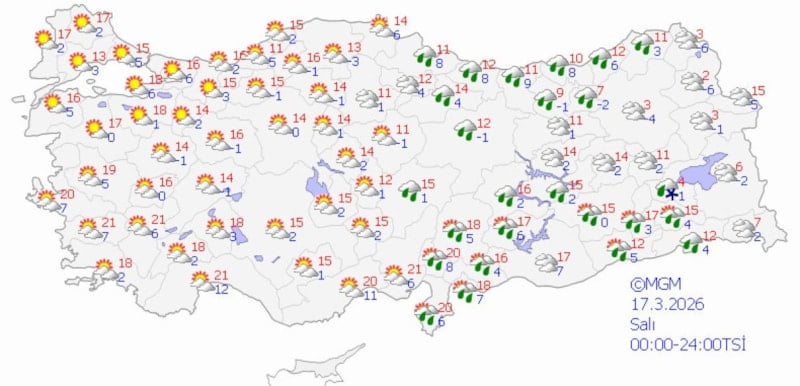 MGM'nin son verilerine göre doğu bölgelerde sıcaklıkların normallerin altında seyrettiği ve bugün en soğuk günlerden biri yaşanacağı öngörülüyor. Batı bölgelerde ise günlük en yüksek sıcaklıklar 10-18 derece arasında değişecek.