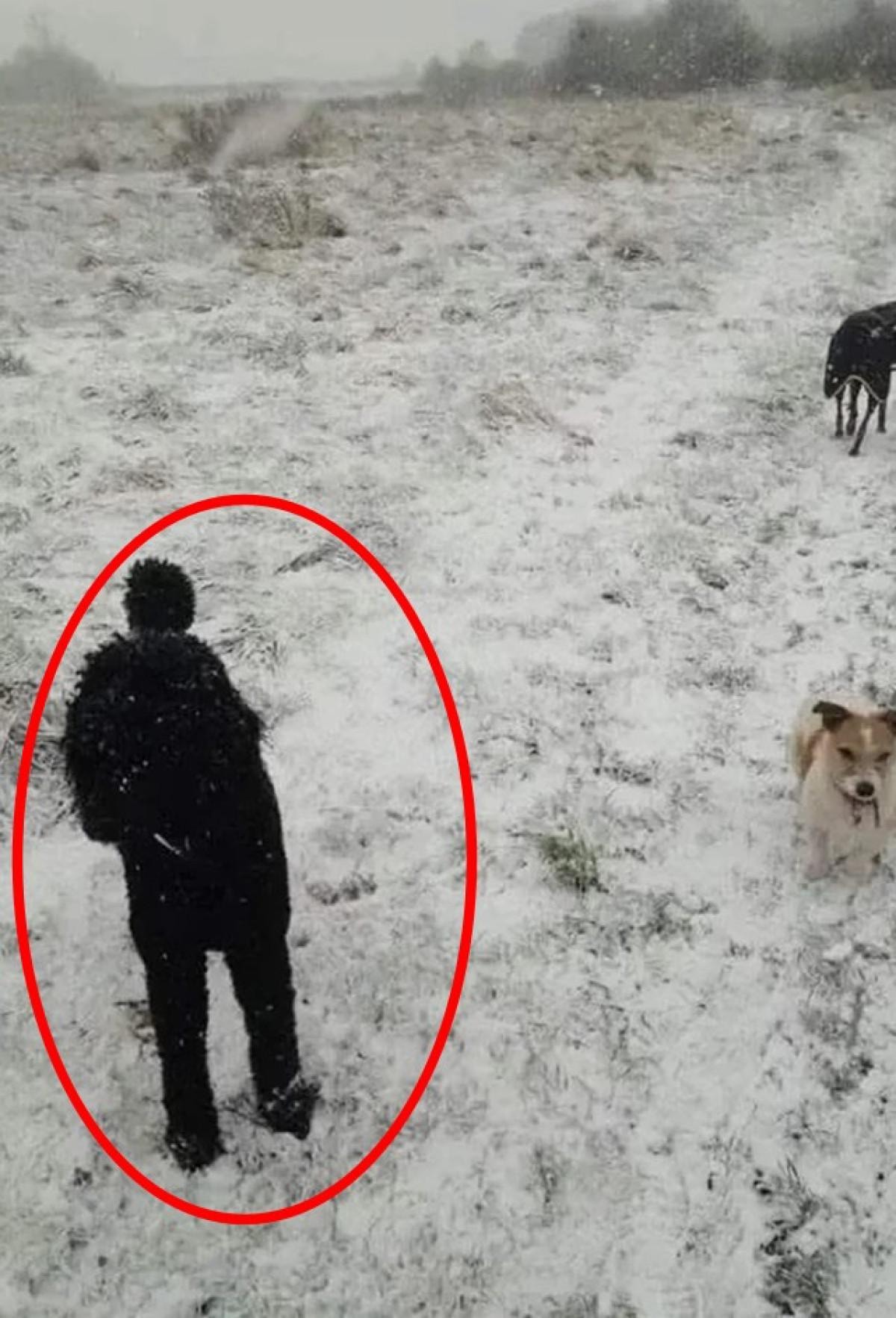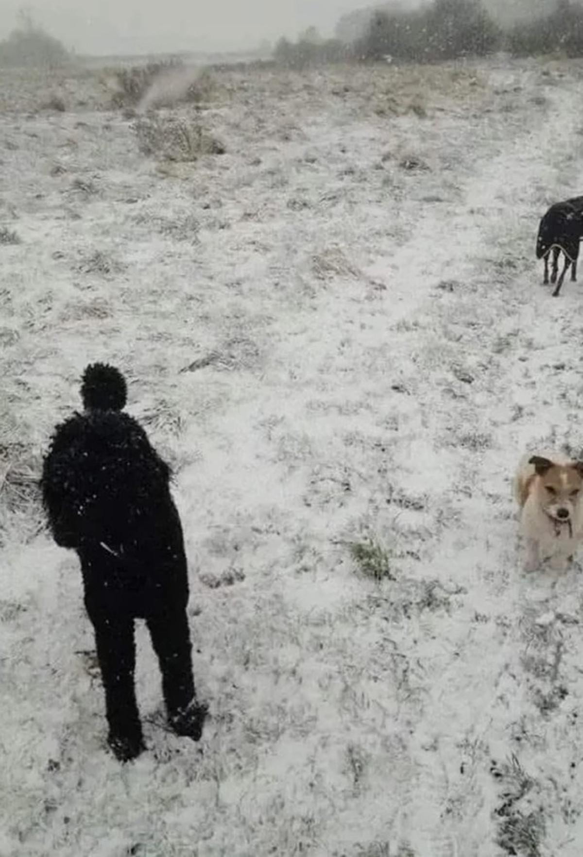 Yukarıda paylaşılan resimde, karlı bir alanda ayakta duran iki köpek yer alıyor.